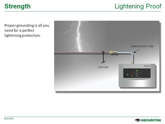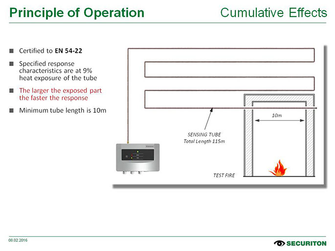 O SecuriSens ADW 535 tira proveito de um princípio físico: se a temperatura ambiente aumenta em caso de incêndio, o volume do ar aquecido também se expande. Tubos de detecção cheios de ar transmitem esse aumento de pressão a um sensor no processador do terminal de cabos. O sistema aciona um alarme assim que o limite definido for ultrapassado. Dois tubos de detecção (Double Tube) podem ser conectados ao SecuriSens ADW 535. Isso significa que a área de monitoramento é dobrada e que o sistema pode ser ajustado de forma ideal de acordo com a área e as diretrizes de instalação aplicáveis.