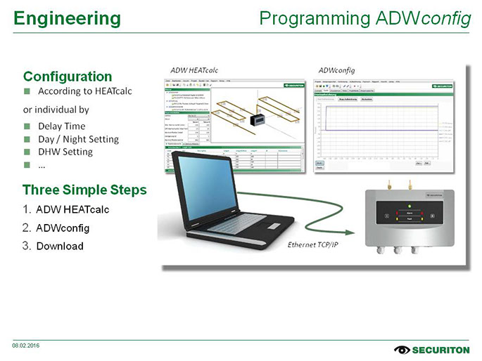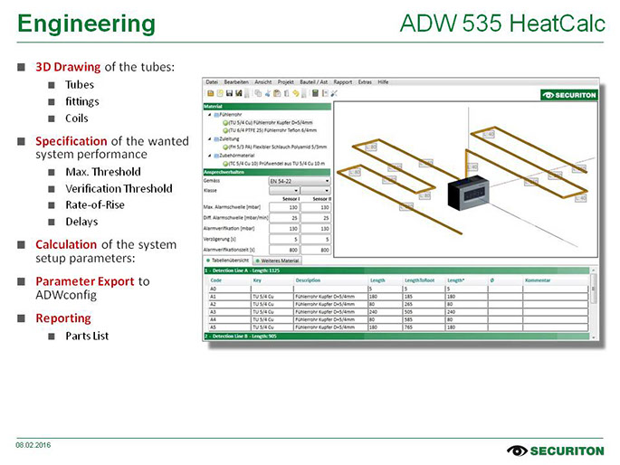 A ferramenta de software ADW HeatCalc da Securiton permite o planejamento de sistema já numa etapa muito precoce. Uma planta baixa é a única coisa necessária para começar o trabalho. A configuração dos tubos é desenhada com apenas alguns cliques do mouse, e o programa ajuda onde é possível. São gerados automaticamente um relatório detalhado para a documentação da planta e uma lista completa de peças para a encomenda de materiais. Todos os artigos têm aprovação do VdS.